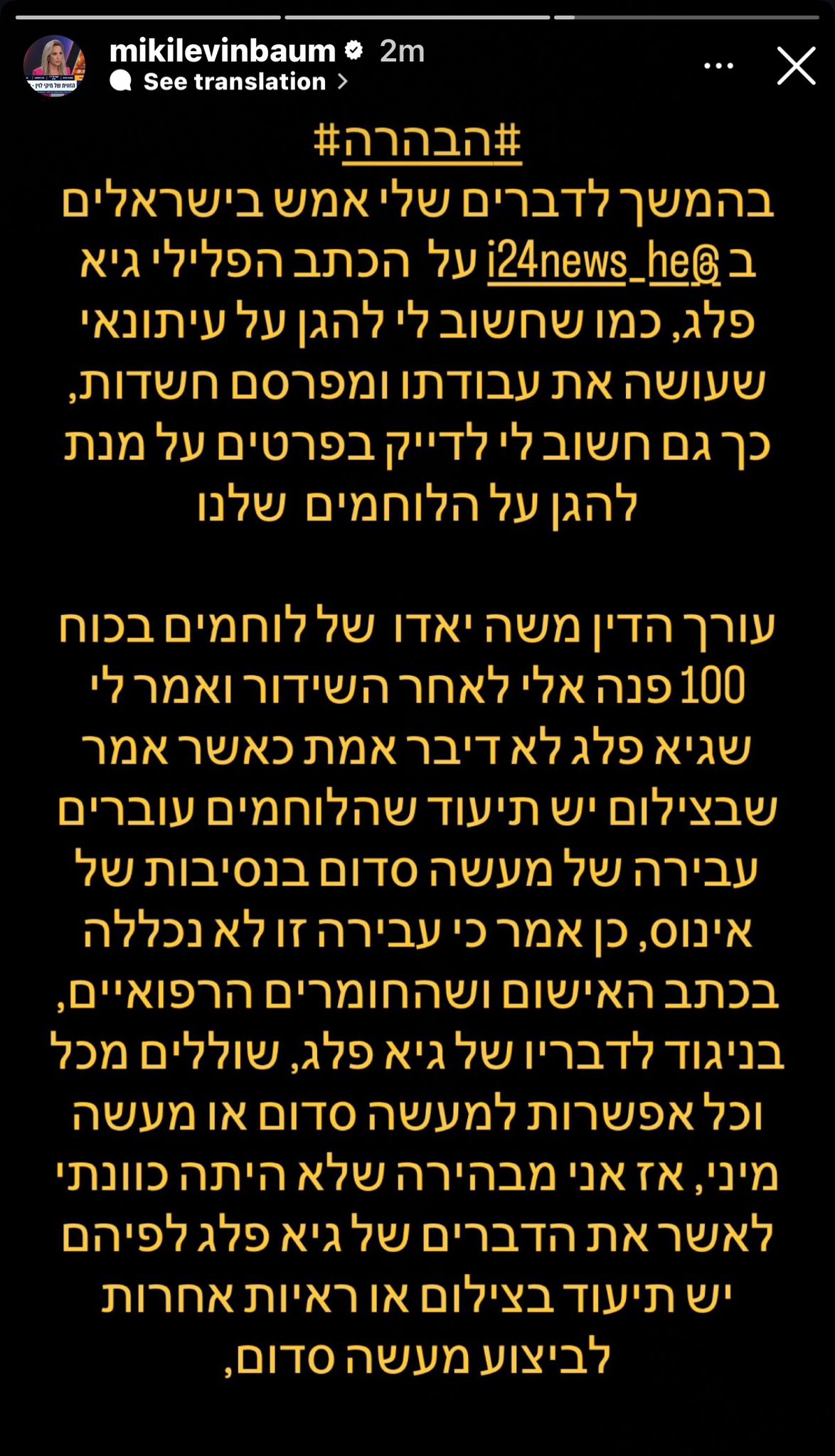 עיתונאית מעריב ופאנליסטית "הישראלים" ב-I24NEWS מיקי לוין הגיבה על הדברים שאמרה אמש בו הצדיקה את דבריו של גיא פלג: "כמו שחשוב לי להגן על עיתונאי שעושה את עבודתו ומפרסם חשדות, כך חשוב לי לדייק בפרטים ולהגן על הלוחמים שלנו"