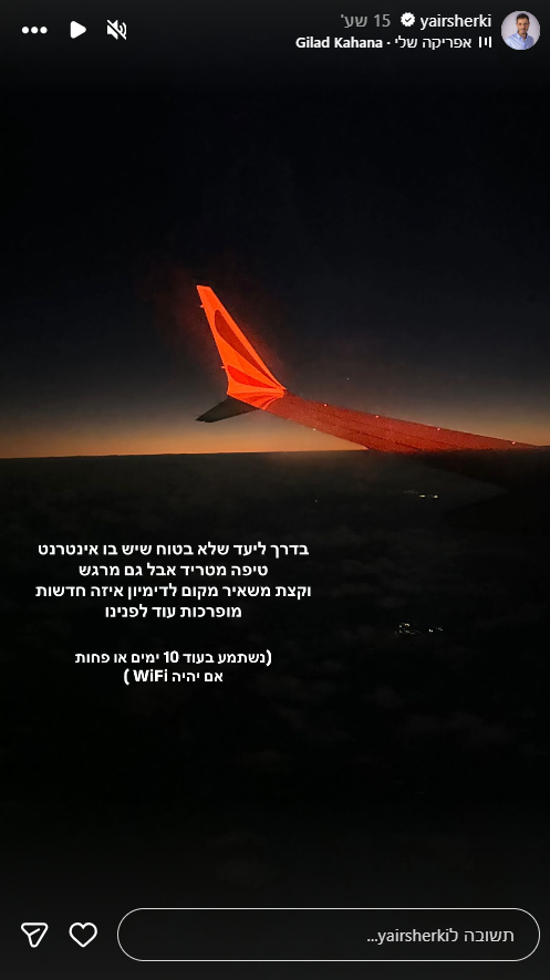 העיתונאי ומגיש הטלוויזיה נפרד לזמן מה מישראל לצורך חופשה ביעד מסתורי. לצד תמונה שפרסם באינסטגרם, כתב יאיר שרקי: "אני בדרך ליעד שלא בטוח שיש בו אינטרנט. נשתמע בעוד 10 ימים או פחות, אם יהיה WIFI"