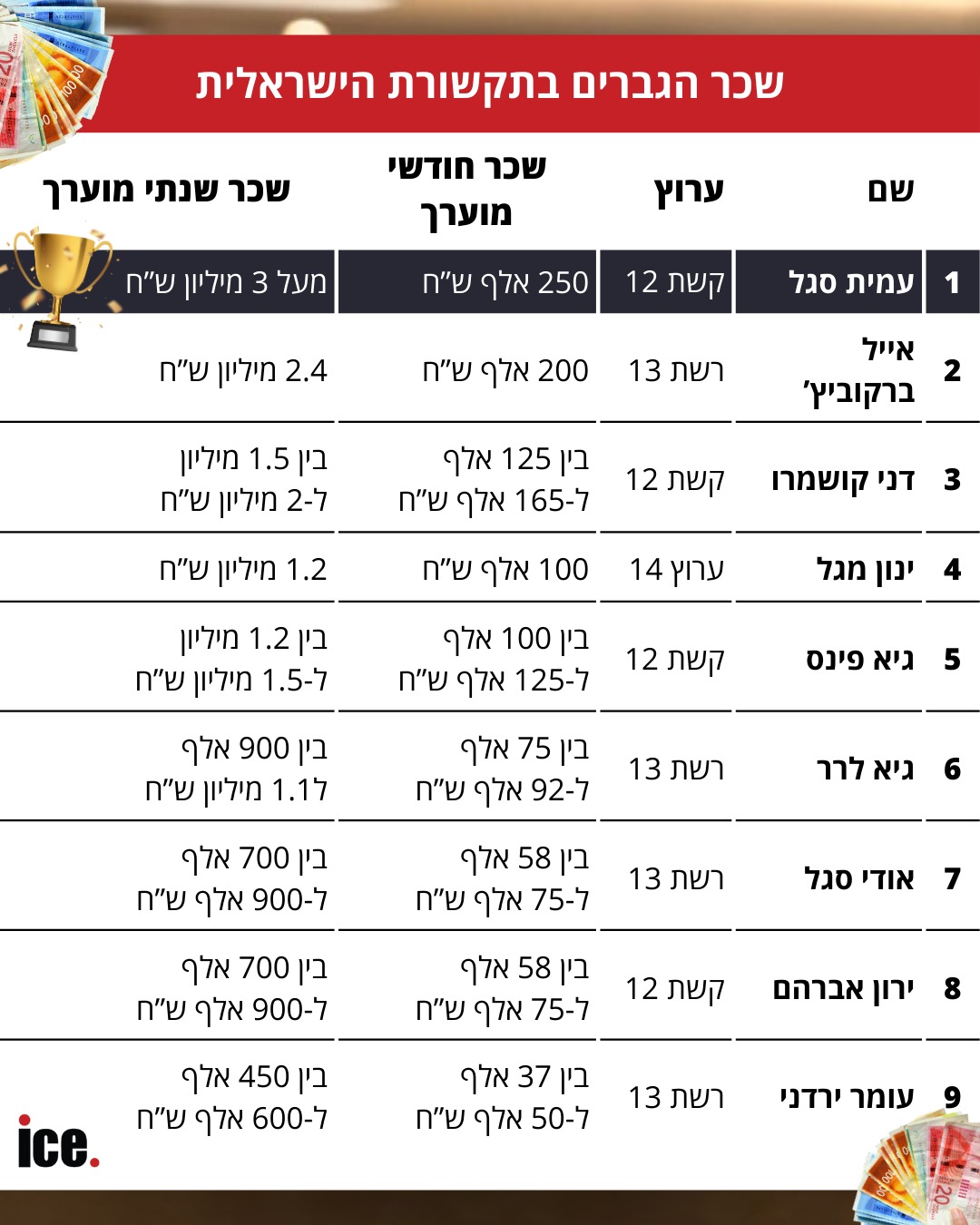 מהנתונים שהגיעו ל-ice עולה עוד כי טווחי השכר בחדשות 12 ו-13 נעים סביב 1.5-2 מיליון שקל לשנה (עלות מעביד) עבור טאלנטים בכירים. שכר עיתונאי רגיל, לא מגיש בכיר, נע סביב 144-154 אלף שקל לשנה לפי נתוני Glassdoor. מגיש חדשות מוביל יכול להגיע להכנסות שנתיות של 500 אלף שקל עד 2 מיליון שקל, בהתאם לוותק ולרשת.