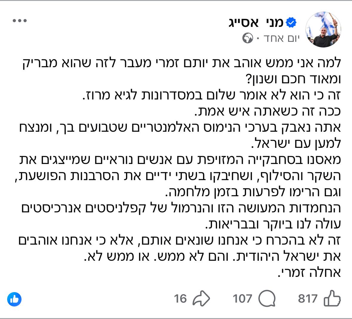 הפוסט של מני אסייג (צילום מתוך: פייסבוק מני אסייג)