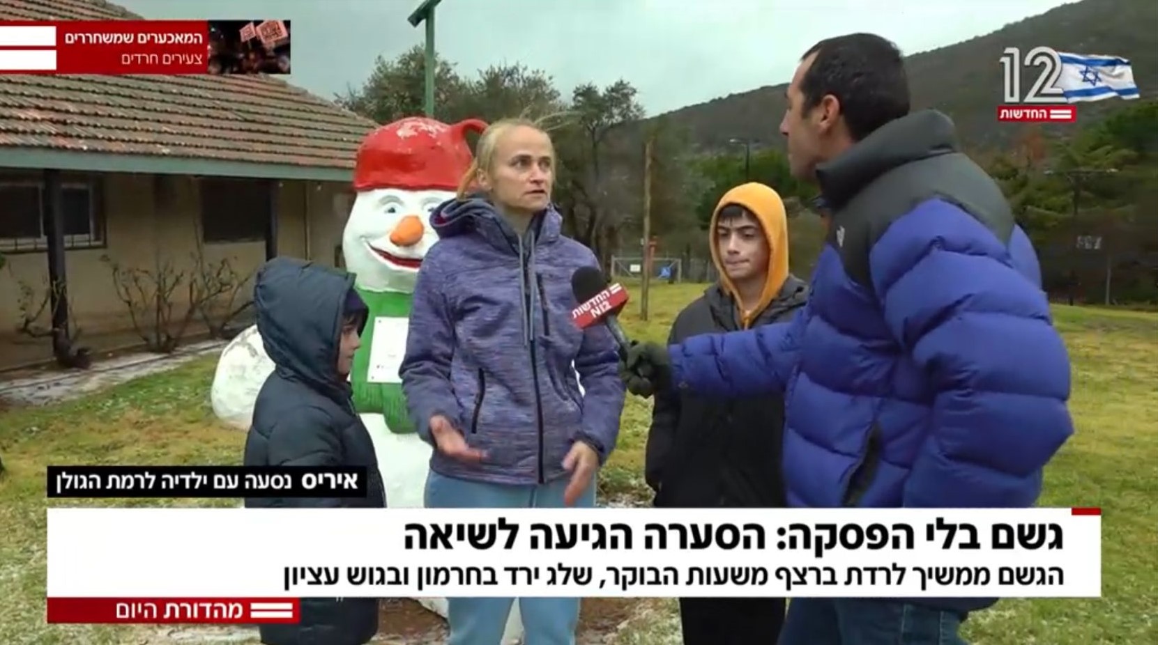 גיא ורון, כתב הצפון של חדשות 12, ראיין את איריס, אם מאוכזבת שהגיעה עם שני בניה למושב נווה אטי"ב בכדי ליהנות מהשלג שהיה אמור לרדת, כך על פי התחזיות. בדבריה, האם המותשת הביעה ביקורת כלפי החזאי של חדשות 12 שהודיע כי שלג כבד צפוי לרדת באזור, דבר שלא קרה בסופו של דבר.