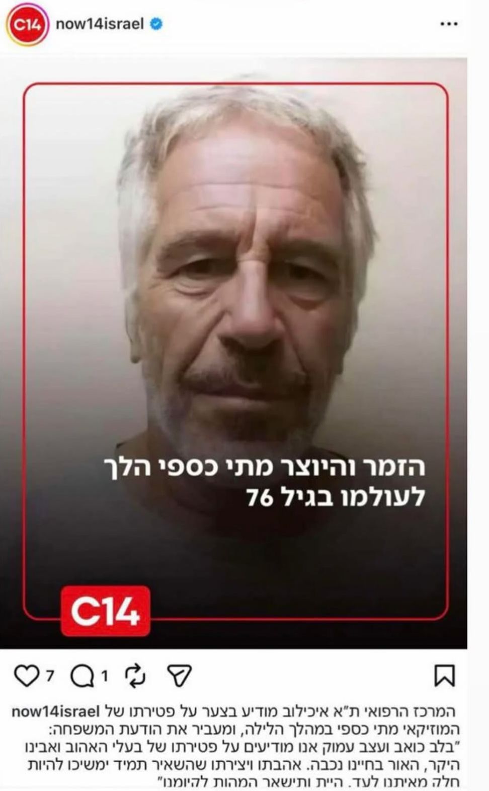 אלא שעל גבי הפוסט שהעלו, בערוץ 14 צירו תמונה של ג'פרי אפשטיין במקומו של מתי כספי ז"ל וכתבו ברקע: "הזמר והיוצר מתי כספי הלך לעולמו בגיל 76". ברשת נוצרה סערה גדולה בעקבות כך ומגיבים רבים טענו כי בערוץ 14 עשו את זה בכוונה: "איזה גועל, הם עשו את זה בכוונה"," ערוץ מתוער, בושה - אין מילים", "יותר נמוך מזה אי אפשר לרדת", ועוד.
