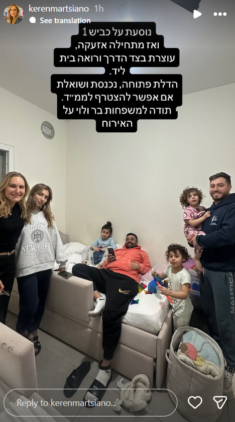 "אני נוסעת על כביש 1 ואז מתחילה אזעקה. אני עוצרת בצד הדרך ורואה בית ליד. הדלת פתוחה, נכנסת ושואלת אם אפשר להצטרף לממ"ד. תודה למשפחות בר ולוי על האירוח", כתבה קרן מרציאנו לצד תמונה שפרסמה עם בני המשפחה שאירחו אותה במהלך האזעקה.