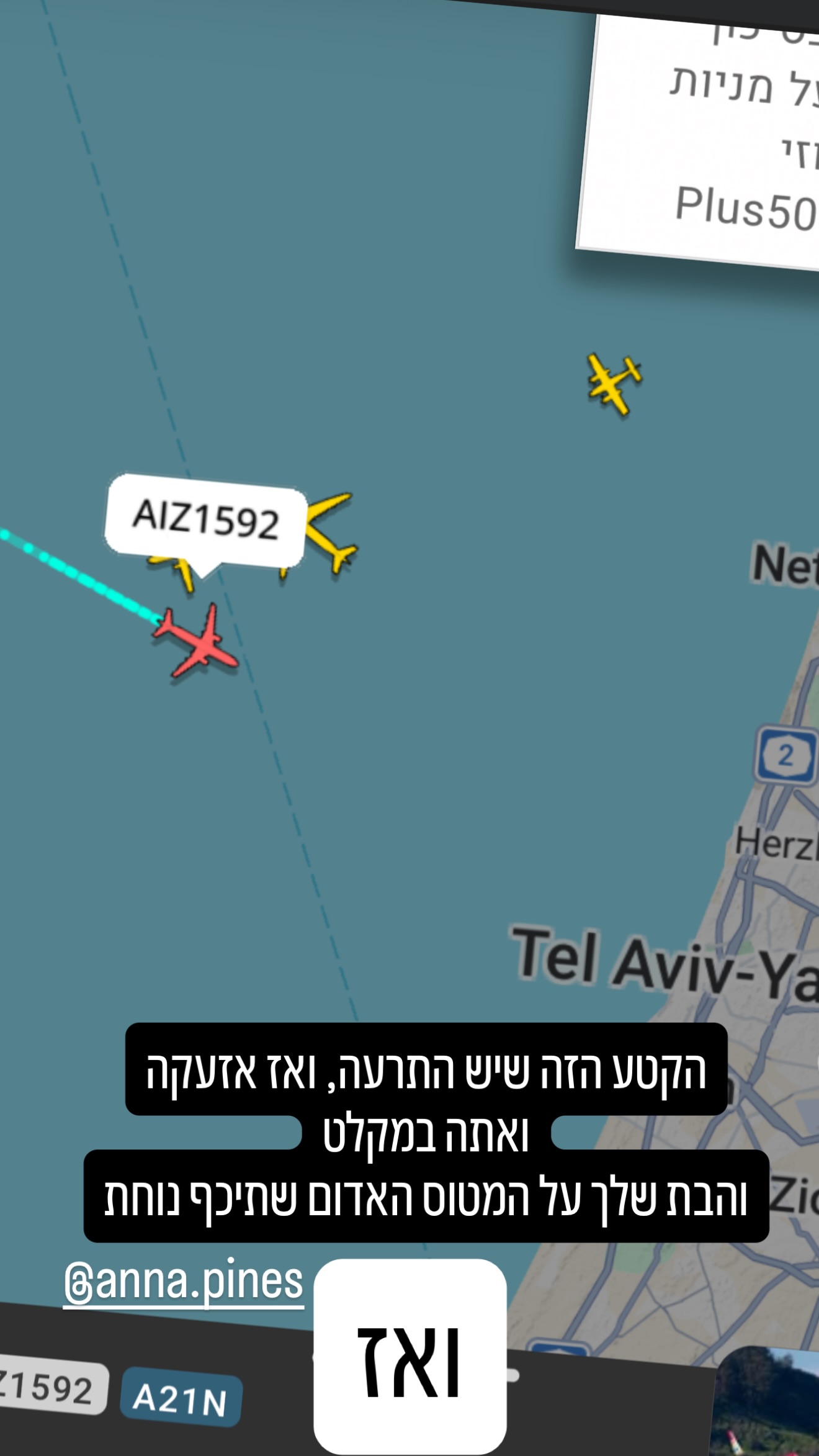 אביה, גיא פינס, מגיש "ערב טוב עם גיא פינס" שיתף בחשבון האינסטגרם שלו כי הטיסה שעלתה עליה אנה נאלצה לעשות פרסה בעקבות הירי מאיראן. "הקטע הזה שיש התרעה, ואז אזעקה ואתה במקלט והבת שלך על המטוס האדום שתיכף נוחת", כתב ובסטורי לאחר מכן הוא עדכן: "ואז המטוס מפרסס".