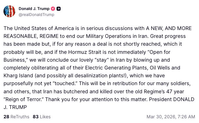 בפוסט שפרסם ברשת החברתית שלו, Truth Social, חשף טראמפ טפח מהמגעים המתנהלים מאחורי הקלעים: "ארה"ב מקיימת דיונים רציניים עם משטר חדש ושקול יותר באיראן כדי לסיים את הפעולות הצבאיות שלנו במדינה", כתב הנשיא. לדבריו, הושגה כבר "התקדמות גדולה", והוא מעריך כי סביר שהסכם אכן ייחתם.
