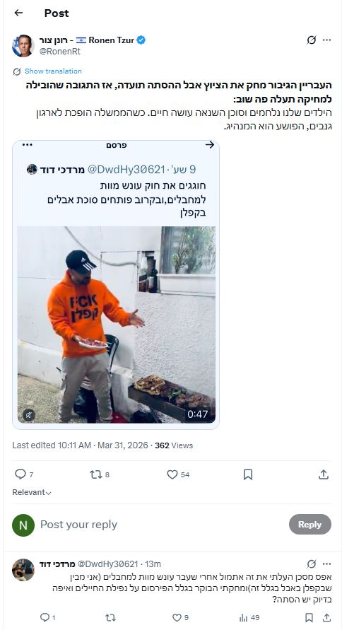 "חוגגים את חוק עונש מוות למחבלים ובקרוב פותחים סוכת אבלים בקפלן", כתב מרדכי לצד התמונה שפרסם ברשת החברתית X. יועץ התקשורת רונן צור לא התחבר בלשון המעטה לגישה שהציג פעיל הימין.
