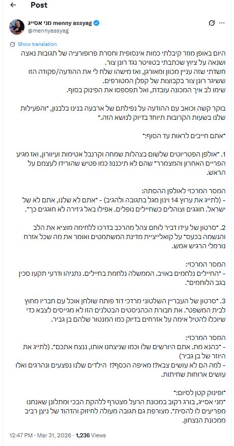לאחר מכן, הציג התסריטאי את ההודעה שלכאורה שלח יועץ התקשורת רונן צור בקבוצת הוואטסאפ של מפגיני קפלן. "'בוקר קשה וכואב עם ההודעה על נפילתם של ארבעה בנינו בלבנון, והפעילות שלנו בשעות הקרובות תיוחד בדיוק לנושא הזה.