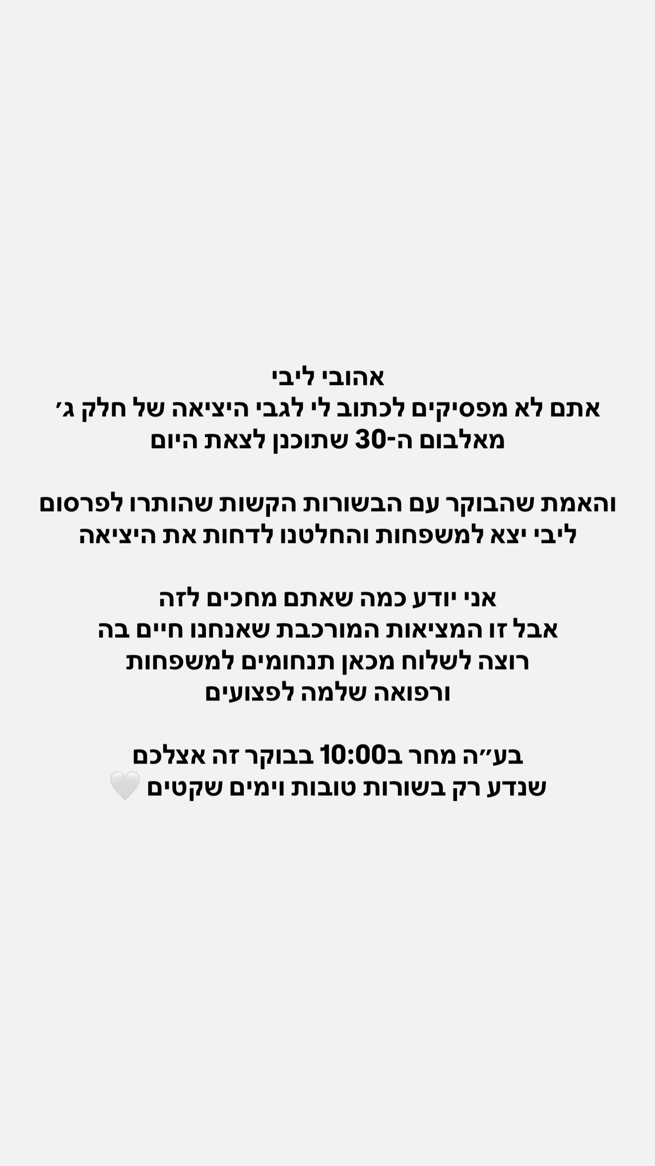 "אהובי ליבי, אתם לא מפסיקים לכתוב לי לגבי היצאיה של חלק ג' מאלבום ה-30 שתוכן לצאת היום", כתב בחשבון האינסטגרם שלו. "והאמת שהבוקר עם הבשורות הקשות שהותרו לפרסום, ליבי יצא למשפחות והחלטנו לדחות את היציאה".