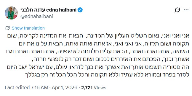 בציוץ שפרסמה היום (רביעי) בחשבון ה-X שלה, תקפה חלבני את ראש הממשלה זאת בעקבות ההצהרה המוקלטת ששודרה אמש (שלישי) בערוצי הטלוויזיה במהלכה הצהיר נתניהו כי "אנחנו כותשים את איראן".