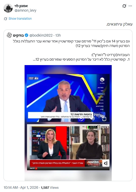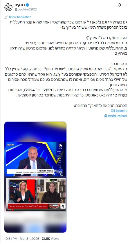 בעמוד ה-X "בודקים", הפועל נגד הפצת פייק ניוז, פורסם ציוץ נגד הערוצים 14 וכאן 11, זאת בטענה לדיווח לא נכון ביחס לעדות של שורד השבי בר קופרשטיין. בפוסט המדובר, נכתב כך: "גם בערוץ 14 וגם ב'כאן 11' פורסם שבר קופרשטיין אמר שהוא עבר התעללות בגלל הסרטון משדה תימן (ששודר בערוץ 12).