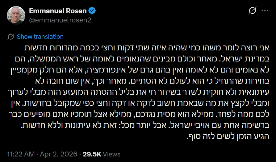 לצד אנשי תקשורת רבים, העיתונאי הוותיק עמנואל רוזן התייחס להצהרה המוקלטת של ראש הממשלה בנימין נתניהו, אשר שודרה בטרם כניסת חג הפסח. נזכיר, בנאומו, אמר נתניהו: "בכל דור ודור עומדים עלינו לכלותינו וגם בדור הזה - משטר האייתוללות עשה מאמץ אדיר להשמיד אותנו ולהשתלט על המזרח התיכון. הוא ניסה לקדם את השאיפות הרצחניות שלו". בהמשך דבריו, ראש הממשלה הבטיח לאזרחי מדינת ישראל: "אנחנו זעזענו את המשטר, ואני אומר שבמוקדם או במאוחר - סופו של המשטר ליפול".