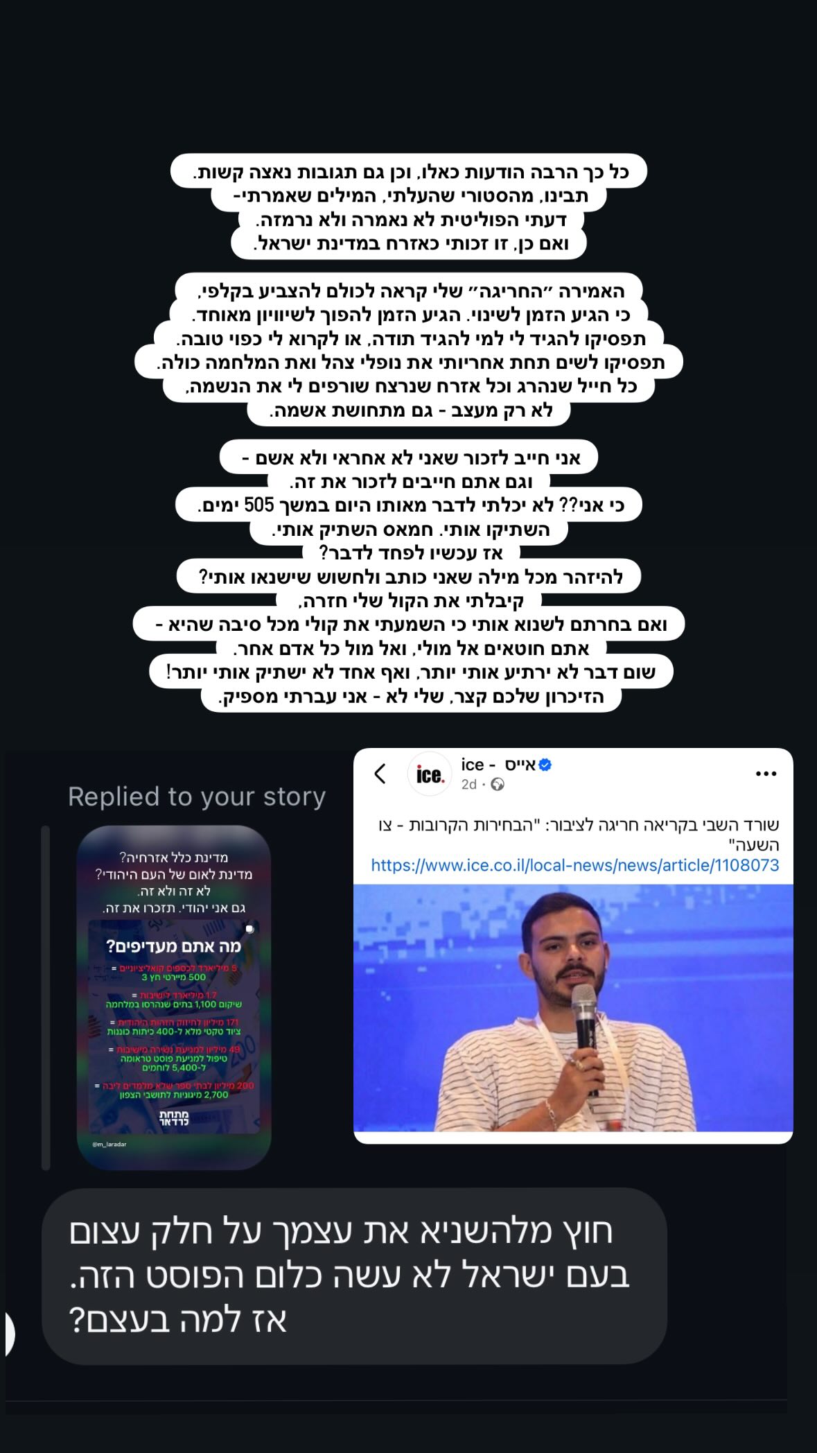 כעת, הוא משתף כי קיבל הודעות נאצה בשל הפרסום, ומבהיר "דעתי הפוליטית לא נאמרה ולא נרמזה. ואם כן, זו זכותי כאזרח במדינת ישראל".