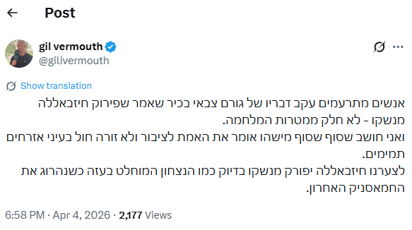 "אנשים מתרעמים עקב דבריו של גורם צבאי בכיר שאמר שפירוק חיזבאללה מנשקו - לא חלק ממטרות המלחמה", כתב והוסיף: "ואני חושב שסוף סוף מישהו אומר את האמת לציבור ולא זורה חול בעיני אזרחים תמימים. לצערנו חיזבאללה יפורק מנשקו בדיוק כמו הניצחון המוחלט בעזה כשנהרוג את החמאסניק האחרון".