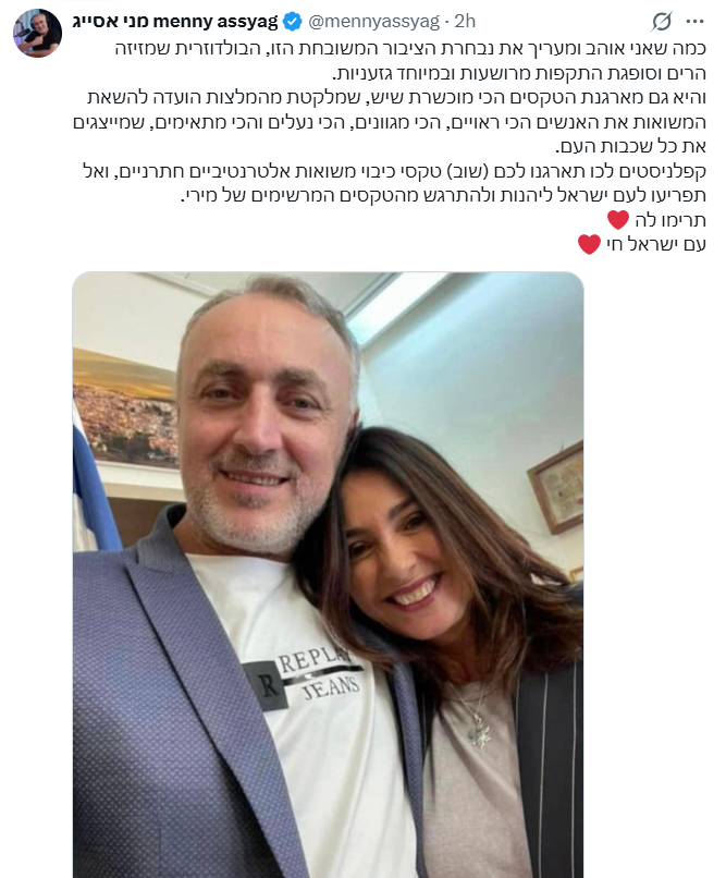 התסריטאי והיוצר שיתף תמונה שלו עם שרת התחבורה מירי רגב וצירף לה שלל מחמאות על עבודתה. לצד זאת הוא גם שלח עקיצה לקפלניסטים וקרא לכולם להרים לשרה