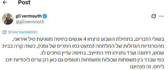 "בשולי הדברים, בתחילת השבוע נרצחו 4 אנשים בחיפה מפגיעת טיל איראני, מהטרגדיות הגדולות של המלחמה (כמעט כמו התריס של גפני), כשזה קרה בבית שמש, דימונה וערד נתניהו מיד התייצב. בחיפה עדיין מחכים לו", כתב בחשבון ה-X שלו.