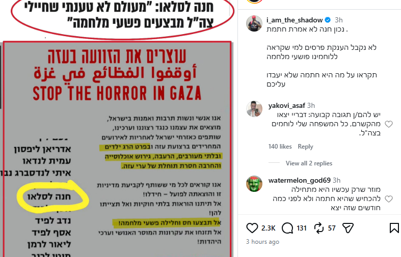 אולם, ההבהרה של לסלאו לא הרגיעה את הראפר ופעיל הימין יואב אליאסי ("הצל"), שבחר לא לעמוד מהצד והחל במתקפה משלו. אליאסי שיתף צילום מסך של עצומה שלטענתו נושאת את חתימתה של השחקנית, ובה האשמות חמורות כלפי לוחמי צה"ל. "נכון חנה, לא אמרת - חתמת", הטיח אליאסי בפוסט חריף והוסיף: "לא נקבל הענקת פרסים למי שקראה ללוחמינו פושעי מלחמה. תקראו על מה היא חתמה שלא יעבדו עליכם".