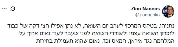 גם כתב חדשות 12, ציון נאנוס כתב בחשבון ה-X שלו על הנאום: "נתניהו, בטקס המרכזי לערב יום השואה, לא נתן אפילו חצי דקה של כבוד לזכרון השואה עצמו ולשורדי השואה לפני שעבר לעוד נאום ארוך על המלחמה נגד איראן, חמאס וכו׳. נאום שהוא תעמולת בחירות".