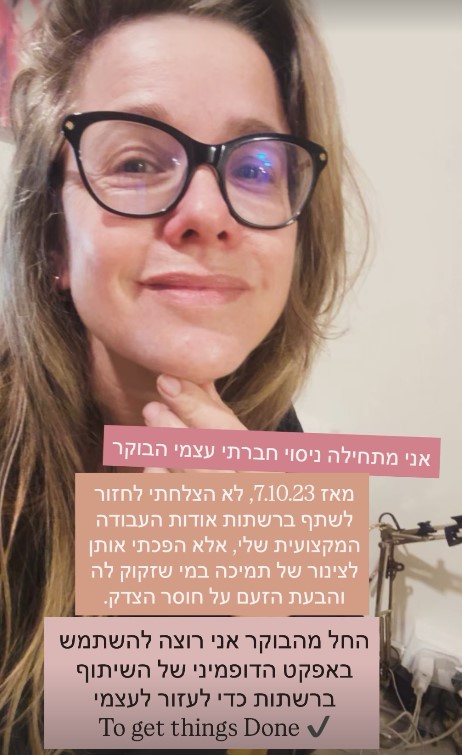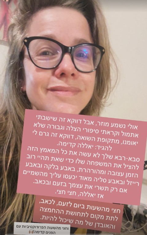 בסטורי נוסף כתבה כיצד עלה לה הרעיון לבצע את זה ואיך הוא קשור ליום הזיכרון לשואה ולגבורה שמצויין היום (שלישי): "אולי נשמע מוזר, אבל דווקא שישבת אתמול וקראתי סיפורי הצלה וגבורה שלא יאומנו, מתקופת השואה, דווקא זה גרם לי להגיד: 'יאללה, קדימה'".