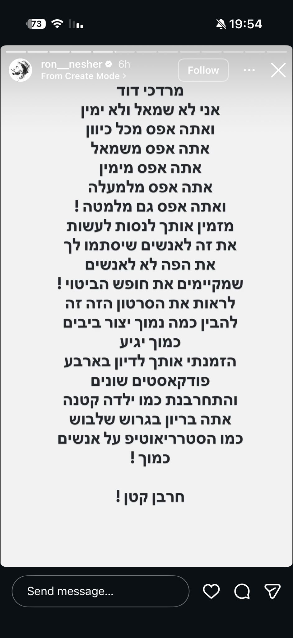 "מרדכי דוד, אני לא שמאל ולא ימין ואתה אפס מכל כיוון", כתב נשר בסטורי שלו, "אתה אפס משמאל, אתה אפס מימין, אתה אפס מלמעלה ואתה גם מלמטה!".