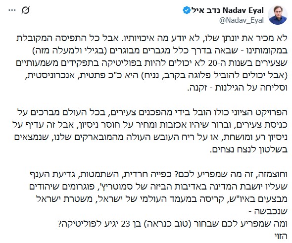 עוד הוסיף: "וחוץ מזה, זה מה שמפריע לכם? כפייה חרדית, השתמטות, גדיעת הענף שעליו יושבת המדינה באדיבות הביזה של סמוטריץ', פוגרומים שיהודים מבצעים באיו"ש, קריסה במעמד העולמי של ישראל, משטרת ישראל שנכבשה - ומה שמפריע לכם שבחור (טוב כנראה) בן 23 יגיע לפוליטיקה? הזוי".