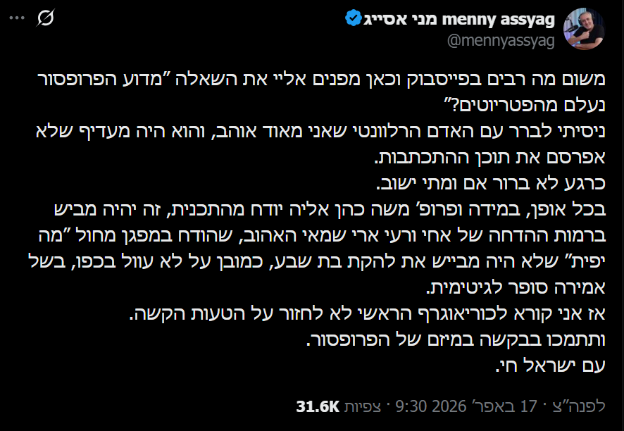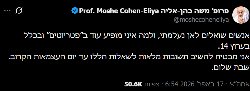 פרופסור משה כהן-אליה, ששימש כפאנליסט קבוע בתוכנית הטלוויזיה "הפטריוטים" בערוץ 14, נעלם לאחרונה מהמסכים, דבר שעורר שיח נרחב ברשתות החברתיות. בתגובה לתהיות הרבות סביב היעדרותו מתוכנית האקטואליה הפופולרית בהגשת ינון מגל, פרסם הפרופסור הישראלי את עמדתו בנושא.