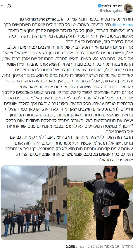 הדבר הזה הולך להישאר איתי עוד הרבה זמן, אבל לא רק איתי. גם עם מדינת ישראל. תתעלמו עכשיו, תתעלמו מחר, הכתם הזה ילווה אותנו עשרות שנים קדימה. והכתם הזה הוא לא רק סמוטריץ', בן גביר או נתניהו. הוא גם כל האנשים מסביבם שמאפשרים אותו, שמסתכלים הצידה, שמעדיפים להתעלם".