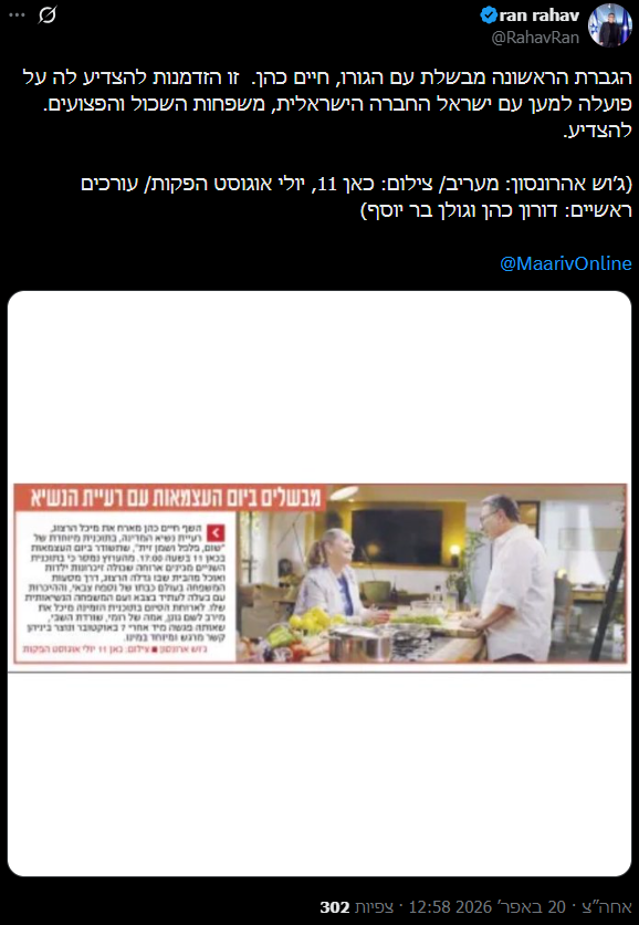 היח"צן רני רהב הגיב לדיווח וכתב בחשבון ה-X שלו: "הגברת הראשונה מבשלת עם הגורו, חיים כהן. זו הזדמנות להצדיע לה על פועלה למען עם ישראל, החברה הישראלית, משפחות השכול והפצועים".