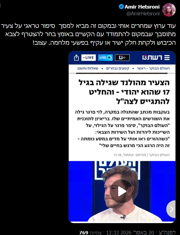 אמיר חצרוני שיתף בפרטי הכתבה, והציג טענה דרמטית כנגד הנהלת רשת 13: "עוד ערוץ שמחרים אותי ובמקום זה מביא למסך סיפור טראגי על צעיר מתוסבך. במקום להתמודד עם הקשיים באומץ, הוא בחר להצטרף לצבא הכיבוש ולקחת חלק ישיר או עקיף בפשעי מלחמה. עצוב".