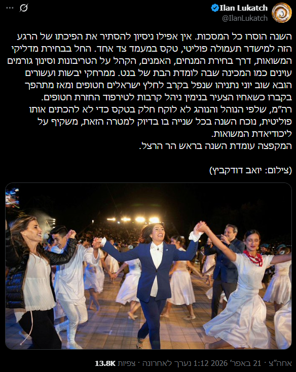אילן לוקאץ', כתב בחברת החדשות של ערוץ 12, מרבה להביע את עמדותיו ביחס לנושאים שזוכים לשיח ציבורי ותקשורתי רחב היקף בישראל. בציוץ שפרסם ברשת החברתית X, העיתונאי הביע ביקורת על הממשלה והשרה מירי רגב, האחראית על אירועי ה-78 למדינת ישראל, זאת בטענה כי טקס יום העצמאות כבר אינו נחשב לממכלתי ולמאחד בין חלקי העם בישראל.