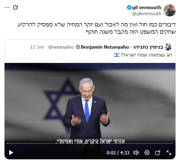 גילי ורמוט, פרשן ספורט 1 ומגיש פודקאסט "קיקטוק" לא נשאר חייב לדבריו של נתניהו בטקס המשואות בהר הרצל ותקף באופן חריף