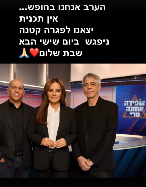 כעת, המגישה המיתולוגית של התוכנית, פרסמה סטורי בעמוד האינסטגרם שלה והודיעה, כי השבוע באופן חד פעמי, התוכנית יוצאת לחופשה והיא לא תשודר. "הערב אנחנו בחופש", כתבה. "אין תוכנית. יצאנו לפגרה". היא הוסיפה כי התוכנית תשוב ביום שישי הבא.