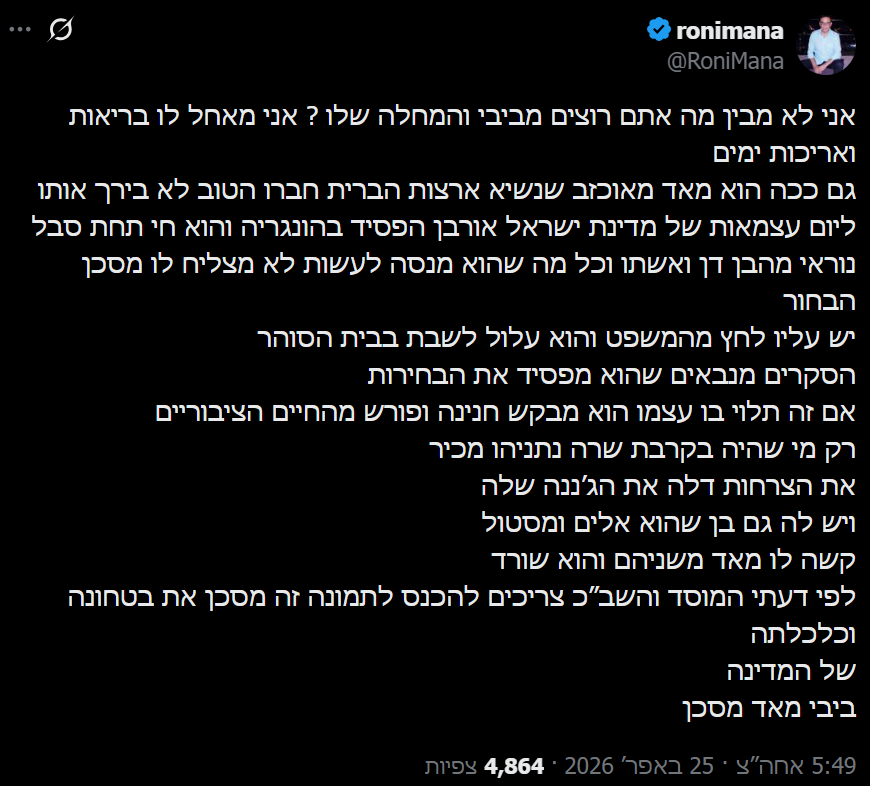 על רקע פרסום נתוני הדו"ח הרפואי השנתי של ראש הממשלה, רוני מאנה התייחס לגילוי המרעיש כי נתניהו עבר ניתוח להסרת גידול סרטני. בציוץ שפרסם ברשת X, כתב רוני מאנה, ככל הנראה בציניות: "קשה לו מאוד והוא שורד"