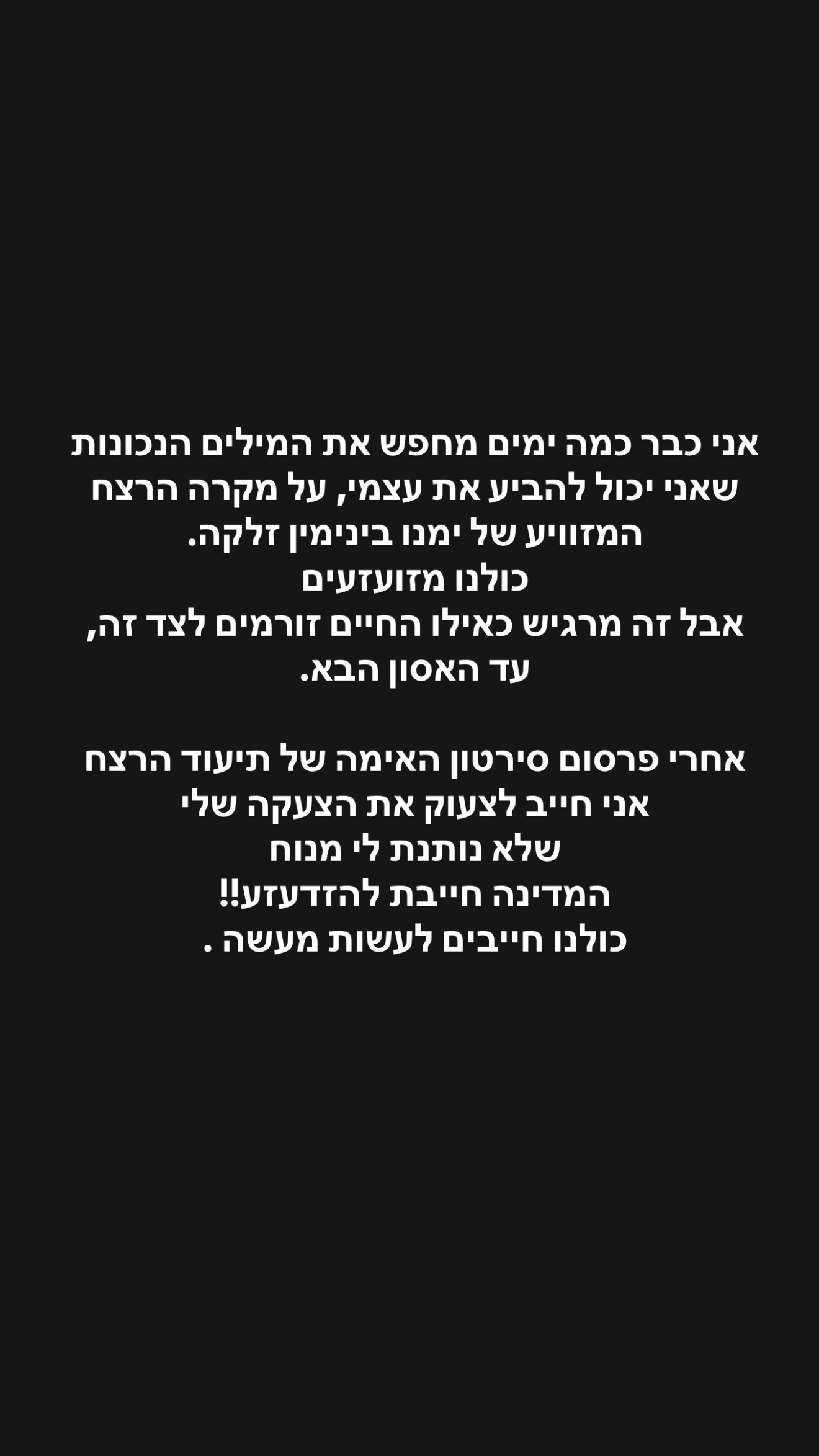 בפוסט שפרסם למאות אלפי עוקביו, ביטא הזמר את התסכול העמוק מהאדישות הציבורית והשגרה שממהרת לחזור לעצמה. "אני כבר כמה ימים מחפש את המילים הנכונות שאני יכול להביע את עצמי על מקרה הרצח המזוויע," כתב גולן בפתח דבריו, והוסיף כי למרות הזעזוע הקולקטיבי, התחושה היא שהחיים פשוט זורמים לצד הטרגדיה עד לאסון הבא. לאחר שנחשף לסרטון הקשה, הוא שיתף כי אינו יכול לשתוק עוד: "אני חייב לצעוק את הצעקה שלי שלא נותנת לי מנוח. המדינה חייבת להזדעזע!! כולנו חייבים לעשות מעשה."