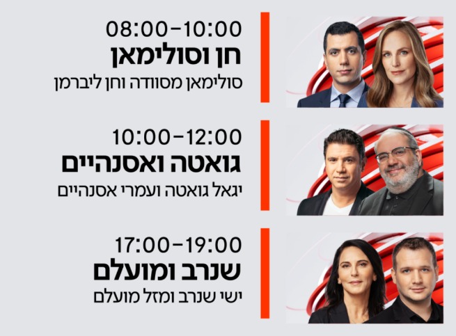 הבוקר ייפתח בטון נשכני במיוחד עם צמד המגישים המוכר מחן 11, סולימאן מסוודה וחן ליברמן. השניים, שמוכרים מהתכנית "זמן אמת", יתפסו את רצועת הבוקר שבין שמונה לעשר.