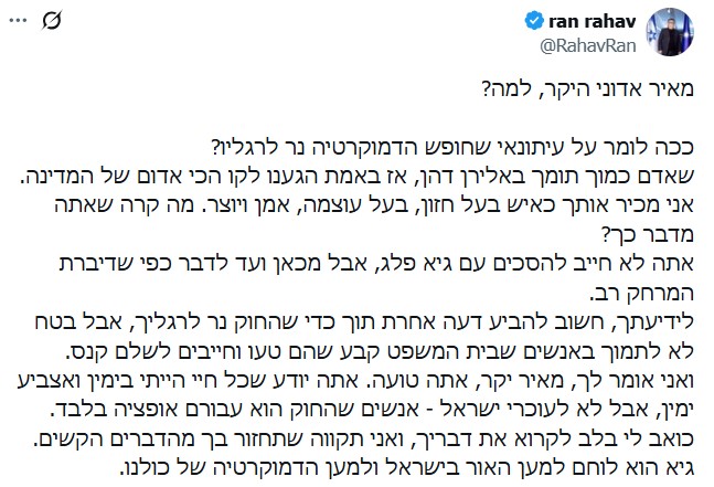 אני אומר לך, מאיר יקר, אתה טועה. אתה יודע שכל חיי הייתי בימין ואצביע ימין, אבל לא לעוכרי ישראל - אנשים שהחוק הוא עבורם אופציה בלבד. כואב לי בלב לקרוא את דבריך, ואני תקווה שתחזור בך מהדברים הקשים. גיא הוא לוחם למען האור בישראל ולמען הדמוקרטיה של כולנו".