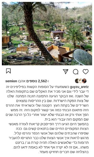 זו-ארץ כתב: "כששמעתי על הסופות הקשות בפיליפינים, זה די עבר לידי וגם אני מכיר את האקלים שם בתקופות האלה של השנה. ואז הבוקר הגיעה התמונה הזו, זה המחנה שלנו של צוות הפקת הישרדות. שם בין ההריסות נמצאים השרידים של בקתת העץ הקטנה שלי וכשראיתי את ההרס הזה, פתאום הבנתי כמה אני קשור למקום הזה. זה ממש הפך אותי ורק אז הבנתי שלא יעזור, אחרי כל כך הרבה שנים שם, המקום הזה עבור הוא בית".