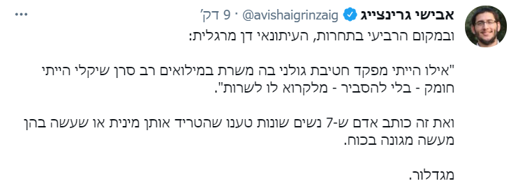 אבישי גרינצייג כינה את מרגלית "מגדלור" והוסיף את "את כתב אדם ש-7 נשים שונות טענו שהטריד מינית".