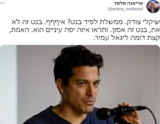 אמש העיתונאית אריאנה מלמד השוותה את שיקלי ליגאל עמיר בציוץ שגרר גם הוא תגובות זועמות: