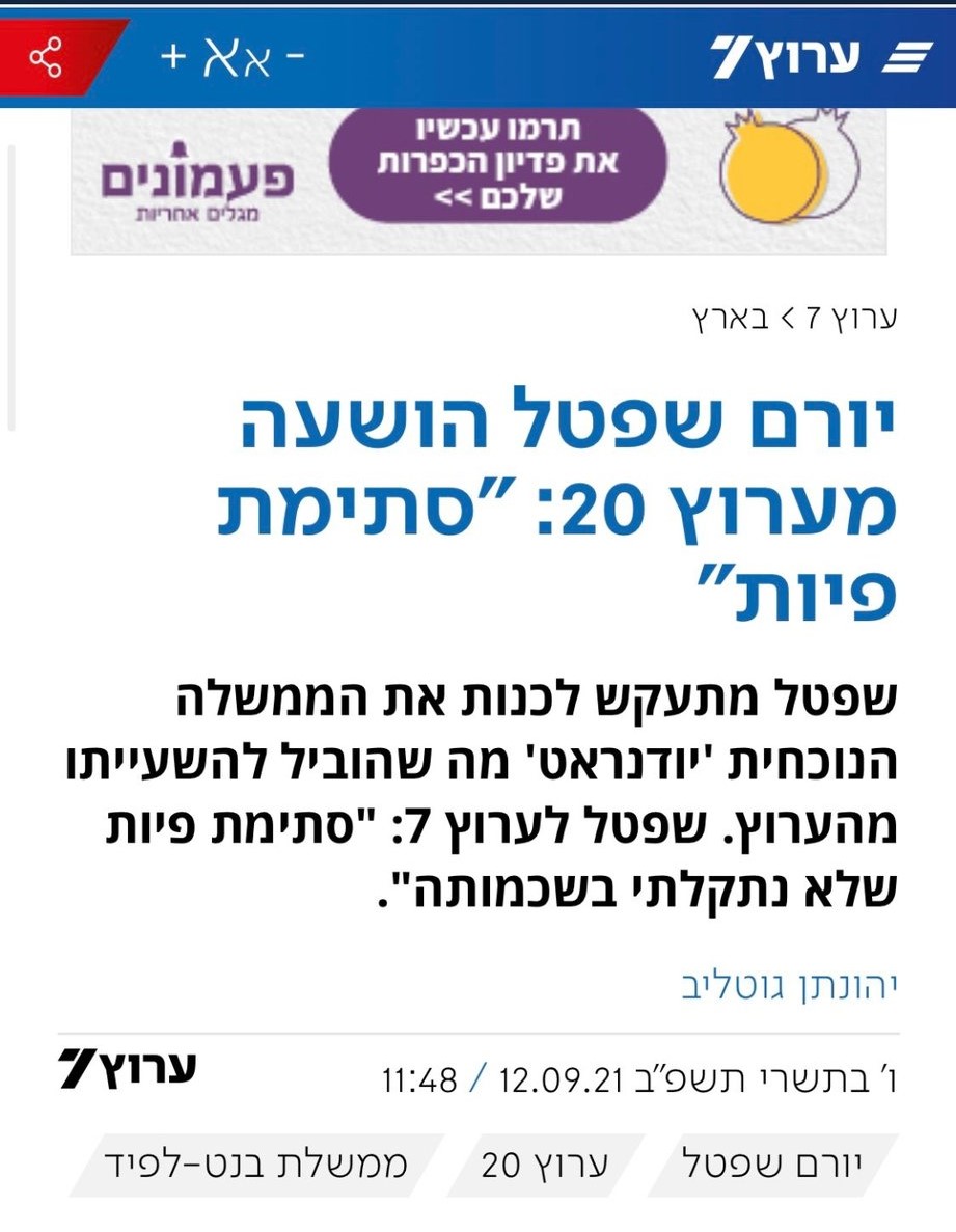 14.שפטלמשה 09/2021/13הגב לתגובה זו14 12אני וחברי הודעה שהועברה ברשתות החברתיות מפסיקים לראות את ערוץ 20 עד ששפטל יחזור לשדר זו סתימת פיות לכל השמאלנים נתתם ללכלך על ביבי ופתאום זה מריע לכם תתבישוסגור