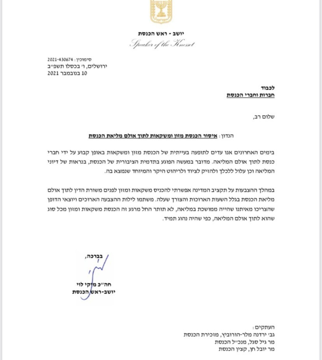 עוד הוסיף: "במהלך ההצבעות על תקציב המדינה אפשרתי להכניס משקאות ומזון לפנים משורת הדין לתוך אולם מליאת הכנסת בגלל השעות הארוכות והצורך שעלה, משתמו לילות ההצבעה הארוכים ויוצאי הדופן שהצריכו מאיתנו שהייה ממושכת במליאה, לא תותר החל מרגע זה הכנת משקאות ומזון מכל סוג שהוא לתוך אולם המליאה כפי שהיה נהוג תמיד".