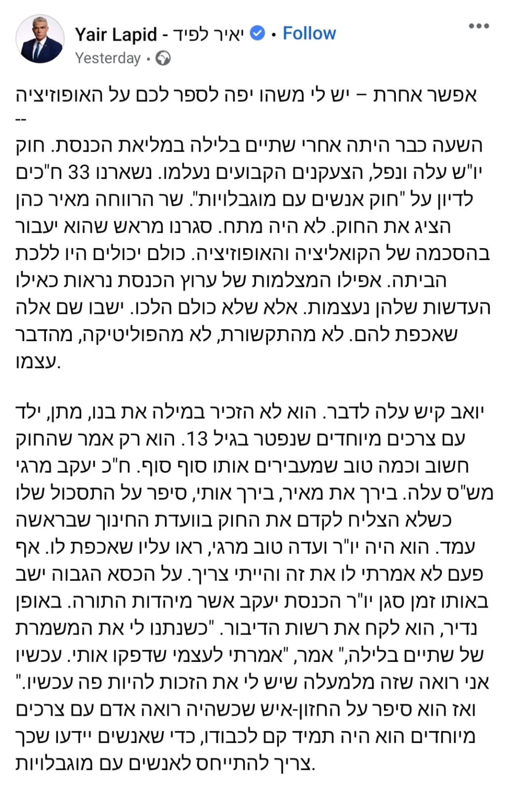 גם ראש הממשלה החליפי ושר החוץ יאיר לפיד שהוא גם אבא ליעלי, אוטיסטית בעלת מוגבלות, העלה אמש פוסט מרגש בו הודה לתומכים שכותרתו: "אפשר אחרת – יש לי משהו יפה לספר לכם על האופוזיציה".בשם הבן: יואב קיש מעביר חוק למען בנו מתן, ילד עם צרכים מיוחדים שנפטר לפני 6 שנים ולא מצליח עצור את הדמעות