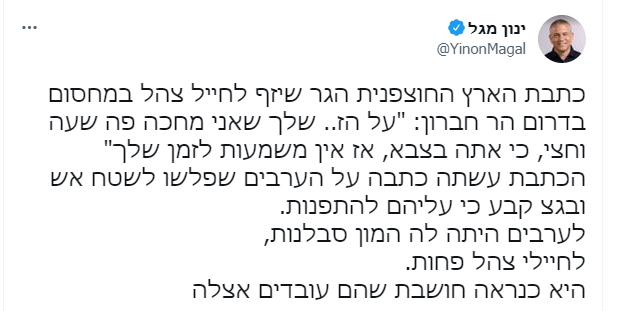 בעקבות הכתבה של כתבת הארץ הגר שיזף על תושבי מסאפר יטא, פרסם היום (רביעי) המגיש ינון מגל סרטון בו היא נראית בשיח לא ראוי מול חיילי צה"ל: "ערבים הייתה לה המון סבלנות, לחיילי צהל פחות".