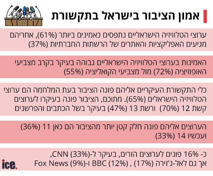 האמינות בערוצי הטלוויזיה הישראליים גבוהה בעיקר בקרב מצביעי האופוזיציה (72%) מול מצביעי הקואליציה (55%), חילונים ומסורתיים (71%-73%) לעומת דתיים (51%) וחרדים (23%) ויהודים (64%) לעומת ערבים (45%). כלי התקשורת העיקריים אליהם פונה הציבור בעת המלחמה הם ערוצי הטלוויזיה הישראלים (65%).
