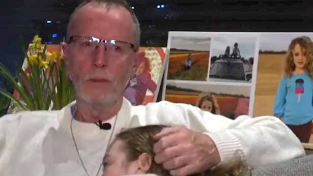 Emily Hand, 9, wipes away her father's tears as he finds out one of the Hamas hostages who was held captive alongside her has been killed.