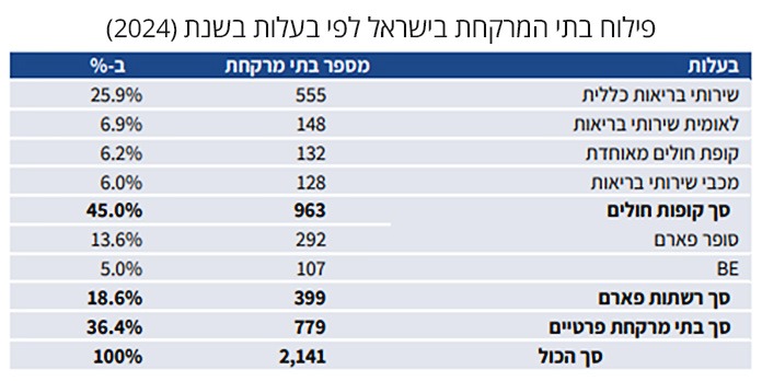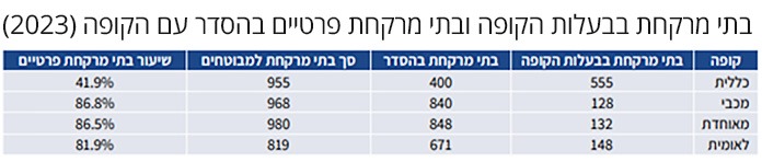 מדו"ח של מרכז המחקר והמידע של הכנסת (הממ"מ) המתייחס ל-2023, עולה כי בקופות החולים מכבי, מאוחדת ולאומית 82% עד 87% מבתי המרקחת העומדים לרשות מבוטחיהם הם פרטיים ובהסדר עימם. בכללית 42% בלבד מבתי המרקחת לרשות המבוטחים הם פרטיים. כללית אשר מצד אחד מהווה את הקופה הגדולה ביותר, עם כ-53% מהנפשות המתוקננות במערכת, נתון המעיד על אוכלוסייה רחבה ומורכבת מבחינה רפואית – אך מצד שני, חלקה של כללית בסך בתי המרקחת עומד על כ-44.6% בלבד ובסך בתי המרקחת שבהסדר על כ-25.7% בלבד. משמע יש פער שעשוי להעיד על פריסה נמוכה יחסית של בתי מרקחת בבעלות הקופה ביחס לגודל אוכלוסיית מבוטחיה. אמנם כללית נהנית מיתרונות לגודל בכל הנוגע לרכש תרופות, אך בפועל יתרונות אלה אינם מתורגמים לשירות נרחב יותר או נגיש יותר למבוטחים – לפחות בכל מה שנוגע למונחי פריסת בתי מרקחת.