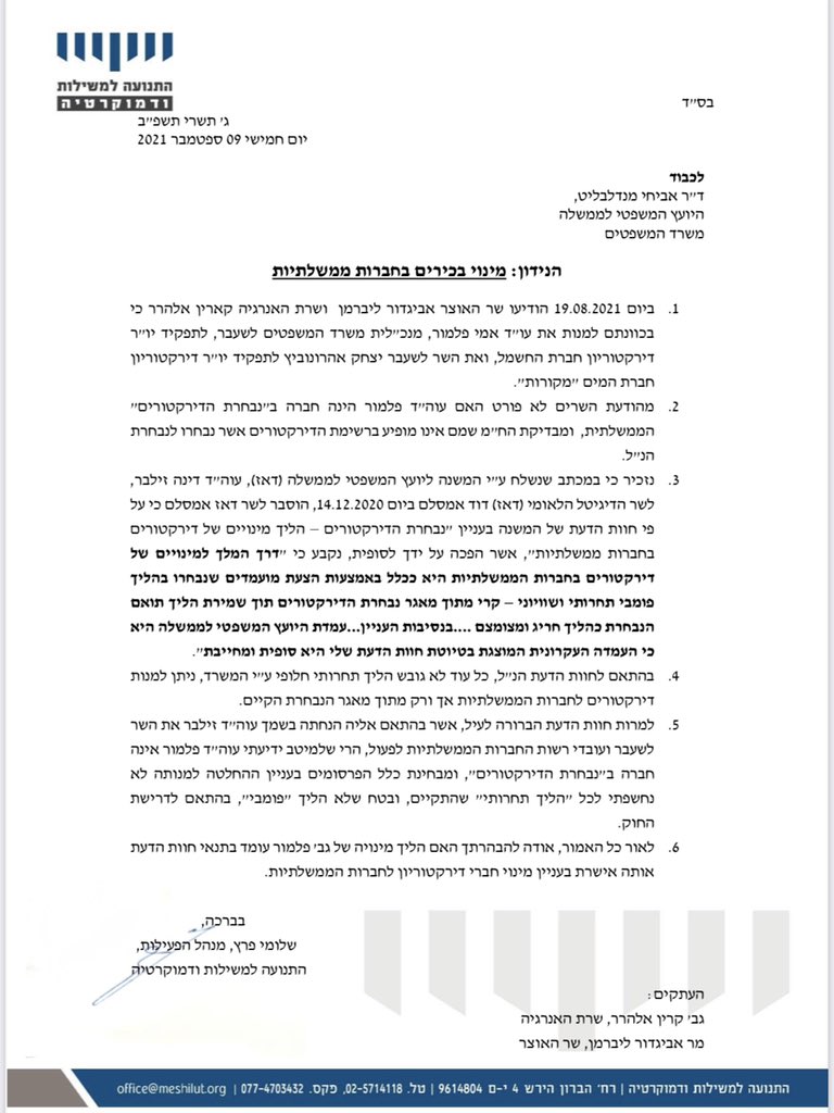 "על פי חוות דעת של המשנה לשעבר ליועמ"ש דינה זילבר, אשר אושרה ע"י מנדלבליט כסופית ומחייבת, נאסר על שר הדיגיטל לשעבר דוד אמסלם, למנות מי שאינו חבר ב"נבחרת הדירקטורים", אלא אם התקיים תהליך מינוי תחרותי , פומבי ושוויוני. במקרה של עוה"ד פלמור, שכיהנה עד לא מכבר כמנכ"לית משרד המשפטים, לא התקיים כל הליך כזה. בפנייתנו ביקשנו מהיועמ"ש הבהרות בנוגע להליך מינויה של פלמור לתפקיד ולסתירה בין עמדתו בעניין מינויי השר אמסלם לבין היעדר עמדתו במקרה הנוכחי".