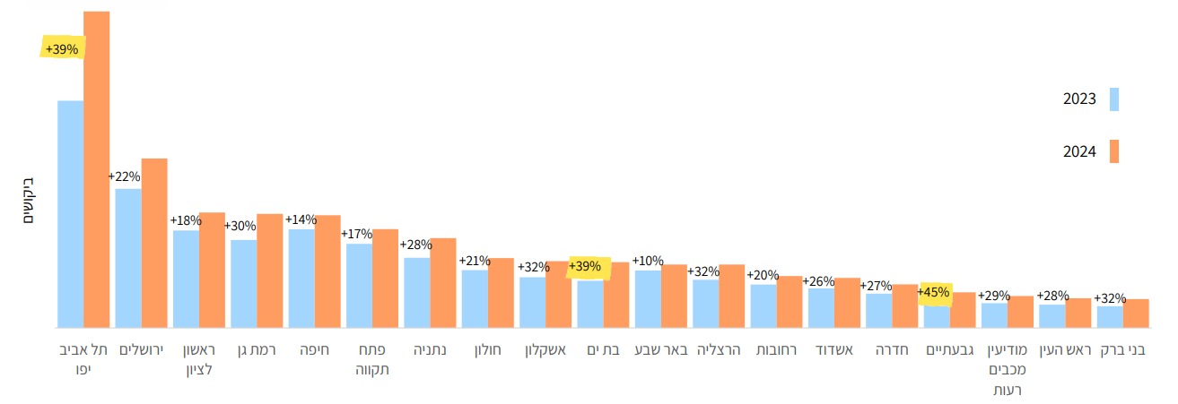 ההפתעה הגדולה מגיעה מתל אביב, לא משום שהיא מובילה את הרשימה הזאת, אלא בשל הקפיצה הגדולה שהיא עשתה לעומת שנת 2023. צריך לזכור כי המדד של יד 2 נעשה על בסיס חיפוש מודעות, אבל קפיצה של 39% היא בהחלט נתון חריג. בראשון לציון שמדורגת שלישית, ישנה עלייה של 18% "בלבד" בביקוש לדירות בשנה החולפת (שימו לב: היא ממוקמת שלישית בשל הביקוש הגבוה לדירות, ולא בשל הזינוק לעומת השנה שעברה). חלק מהסיבה לכך היא ההזדמנות לעבור לעיר השכנה באר יעקב, שם היצע הדירות להשכרה עולה בשנים האחרונות בשל בנייה מואצת. גם ברמת גן אפשר לראות כי מדובר בקפיצה גדולה, של 30%.