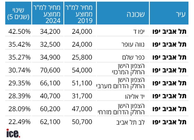 כפי שאפשר לראות, מחירי הדיור ביפו ד' (כאן תוכלו לקבל את תוצאות הבדיקה שערכנו באזור), רשמו את הקפיצה הגדולה ביותר, ולעומת זאת - ביד אליהו, בצפון הישן (בחלק הדרום מזרחי) ובלב תל אביב (בין האזורים היקרים ביותר, כ-62 אלף שקל למ"ר) נרשמה העלייה הצנועה ביותר. החלק המרכזי בצפון הישן רשם קפיצה מרשימה של כ-31% ב-5 שנים והמחיר עומד על מעל 70 אלף שקל למ"ר.