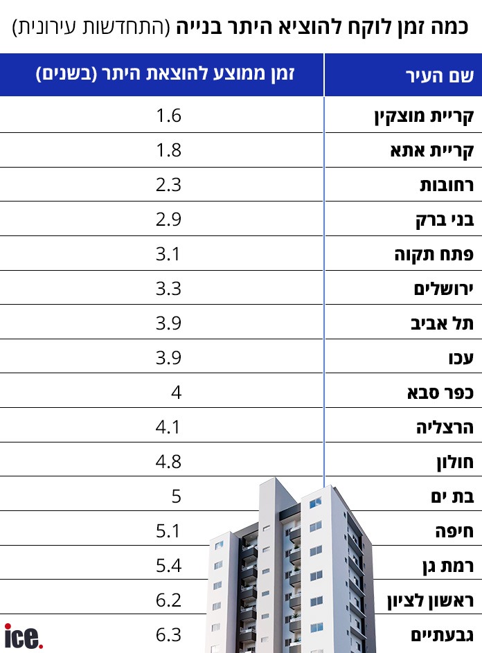 דוח ההתחדשות העירונית, שפורסם לפני כשבוע, מספק הצצה לגבי משך ההליך של הוצאת ההיתר, לפי ערים. במקום הראשון ברשימת הערים שבהן הוצאת היתר הבנייה היא המהירה ביותר, ניצבת עיריית קריית מוצקין, עם 1.6 שנים עד הוצאת ההיתר. במקום השני קריית אתא (1.8 שנים) ואחריהן רחובות (2.3), נהריה וקריית ביאליק (2.8) ובני ברק (2.9 שנים). הערים שבהן לוקח 3-4 שנים להוציא היתר בנייה הן פתח תקוה, ירושלים, תל אביב, עכו, רמת השרון וכפר סבא. בהרצליה, אשדוד וחולון לוקח קצת יותר מארבע שנים.