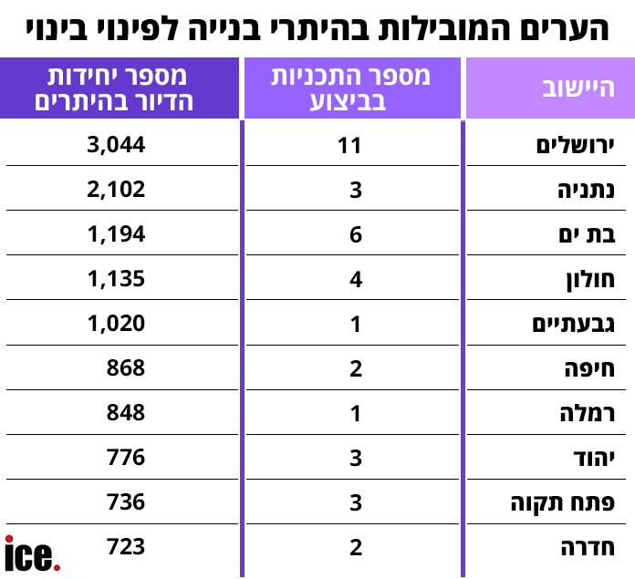 ומה קורה ברשימת הערים שמובילות בהיתרי בנייה לפינוי בינוי? כאן ירושלים ונתניה מובילות ומוציאות פי 2-3 היתרים לעומת כל עיר אחרת.